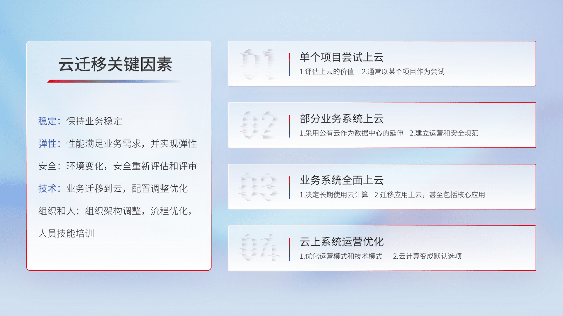 结合实际业务,,,从规划设计、、、、云平台选型、、、、云原生改造、、数据迁移、、、、集成交付,,,,迁移全过程为客户识别最佳上云路径,,做好风险识别管理,,,,设计网络架构、、、身份权限、、安全审计合规、、、、操作审计、、、日志审计、、、、监控告警策略、、、、多站点容灾设计等,,对云上基础设施进行整体规划,,提升IT治理水平,,,,以满足弹性、、高可用、、、、高性能的需求。。。