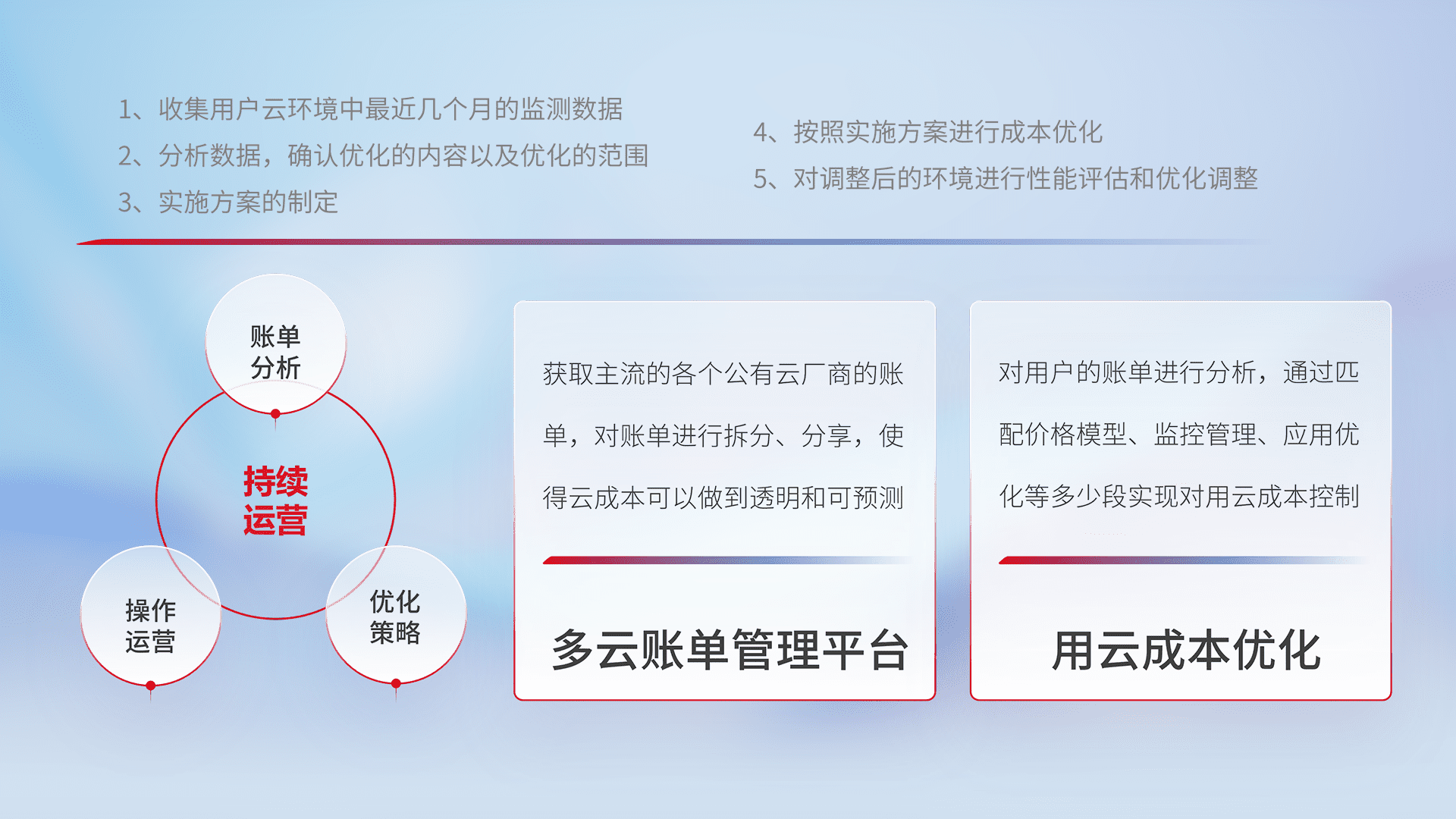 通过多云纳管,,以统一的资源数据模型把客户的云资源进行抽象和封装,,进而实现对多云资源的统一操作,,,,保障云资源管理的可靠性、、稳定性与可用性。。。量身定制化运维内容,,配置、、、开发运维、、、、补丁管理、、、、备份、、、、监控、、、、认证和访问管理、、、、审计和日常巡检等,,,保障在用云过程中的可靠度,,稳定度以及高可用率。。。。